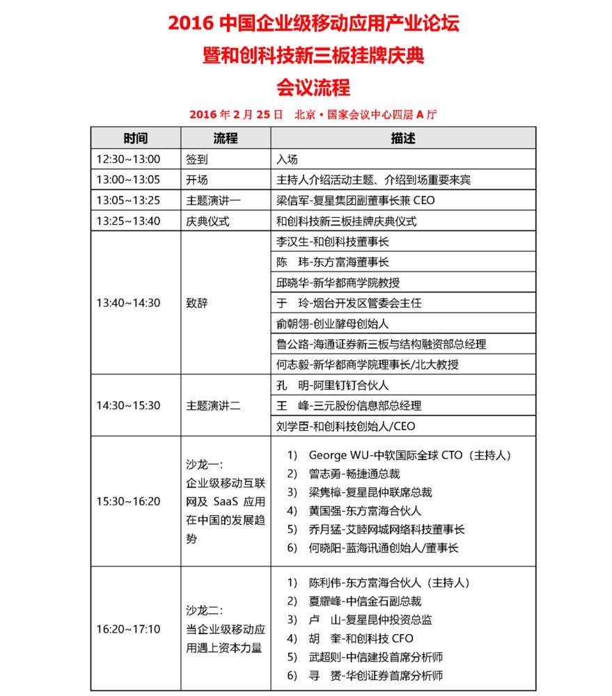 和創(chuàng)科技(證券代碼834218)作為中國(guó)企業(yè)級(jí)移動(dòng)互聯(lián)網(wǎng)SaaS應(yīng)用第一股,是在和創(chuàng)科技各位股東、客戶、合作伙伴及團(tuán)隊(duì)的長(zhǎng)期支持和卓越努力下,服務(wù)了國(guó)內(nèi)近十萬(wàn)家企業(yè)。作為產(chǎn)業(yè)級(jí)SaaS移動(dòng)應(yīng)用的領(lǐng)軍企業(yè),和創(chuàng)科技將聯(lián)合復(fù)星昆仲、東方富海、新華都商學(xué)院于2016年2月25日下午在北京國(guó)家會(huì)議中心共同舉辦“2016中國(guó)企業(yè)級(jí)移動(dòng)應(yīng)用產(chǎn)業(yè)論壇暨和創(chuàng)科技新三板掛牌慶典”,這即是答謝各位股東朋友們的長(zhǎng)期支持,也是剖析產(chǎn)業(yè)級(jí)SaaS行業(yè)在產(chǎn)品研發(fā)、市場(chǎng)營(yíng)銷(xiāo)、運(yùn)維續(xù)費(fèi)和資本進(jìn)入等方面的行業(yè)主題。