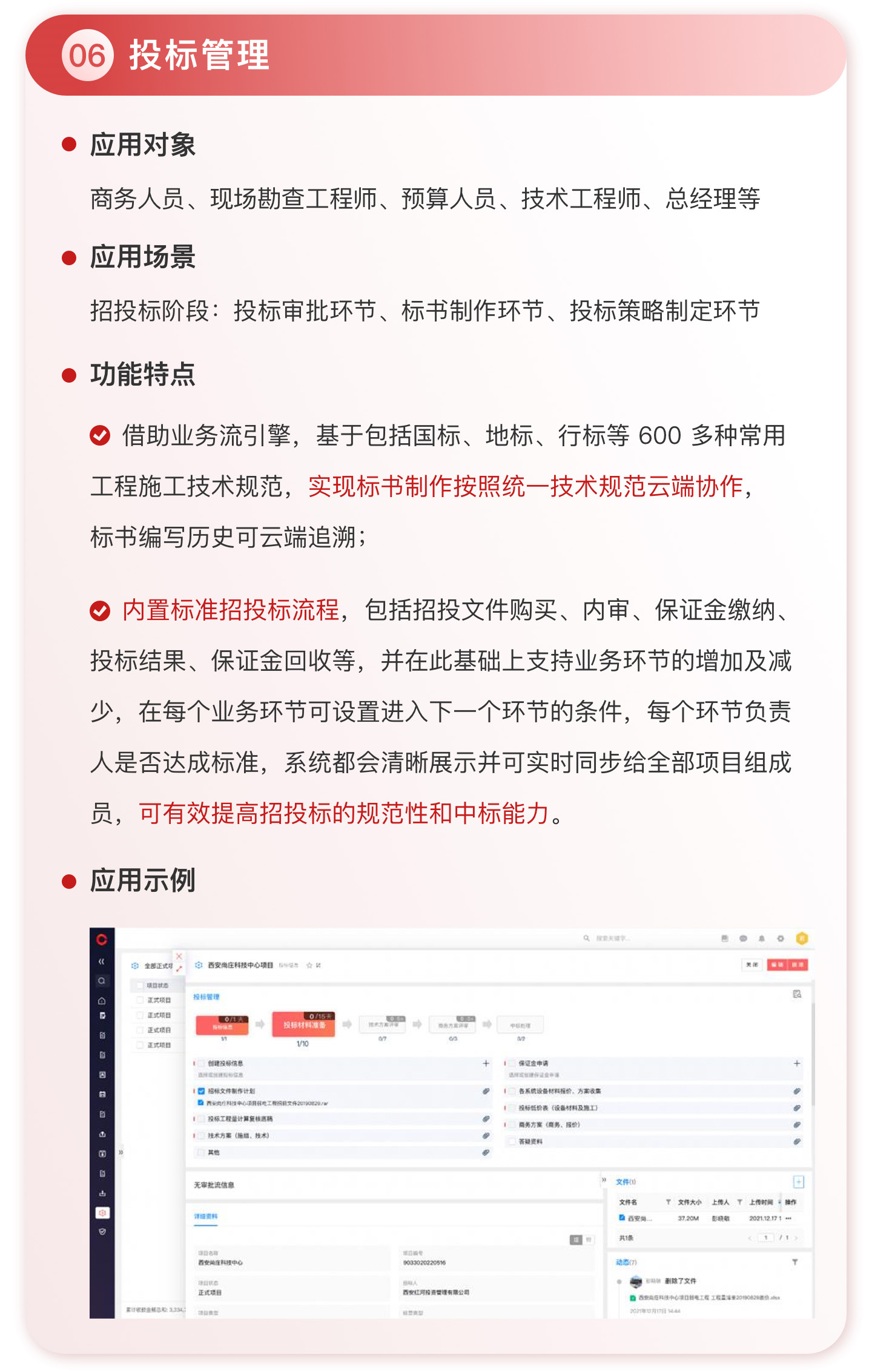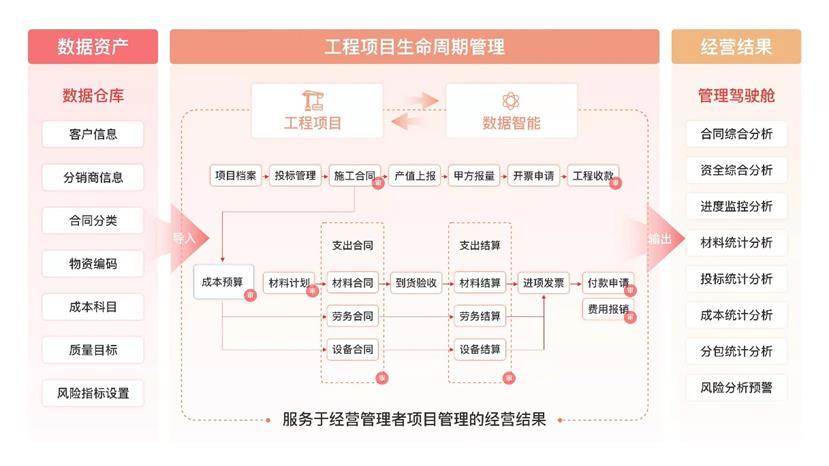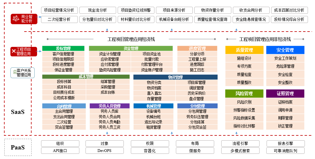 在工程項目管理領域,紅圈在 PaaS 平臺基礎上深入結合建筑工程企業的業務場景,針對其現金流管理薄弱、成本不可控、項目進度滯后、質量問題頻發和安全風險較多等痛點,通過資金管理、成本管理、物資管理、安全質量管理、投標管理、勞務管理、證照管理等功能模塊,使執行人員業務流程標準化、透明化。