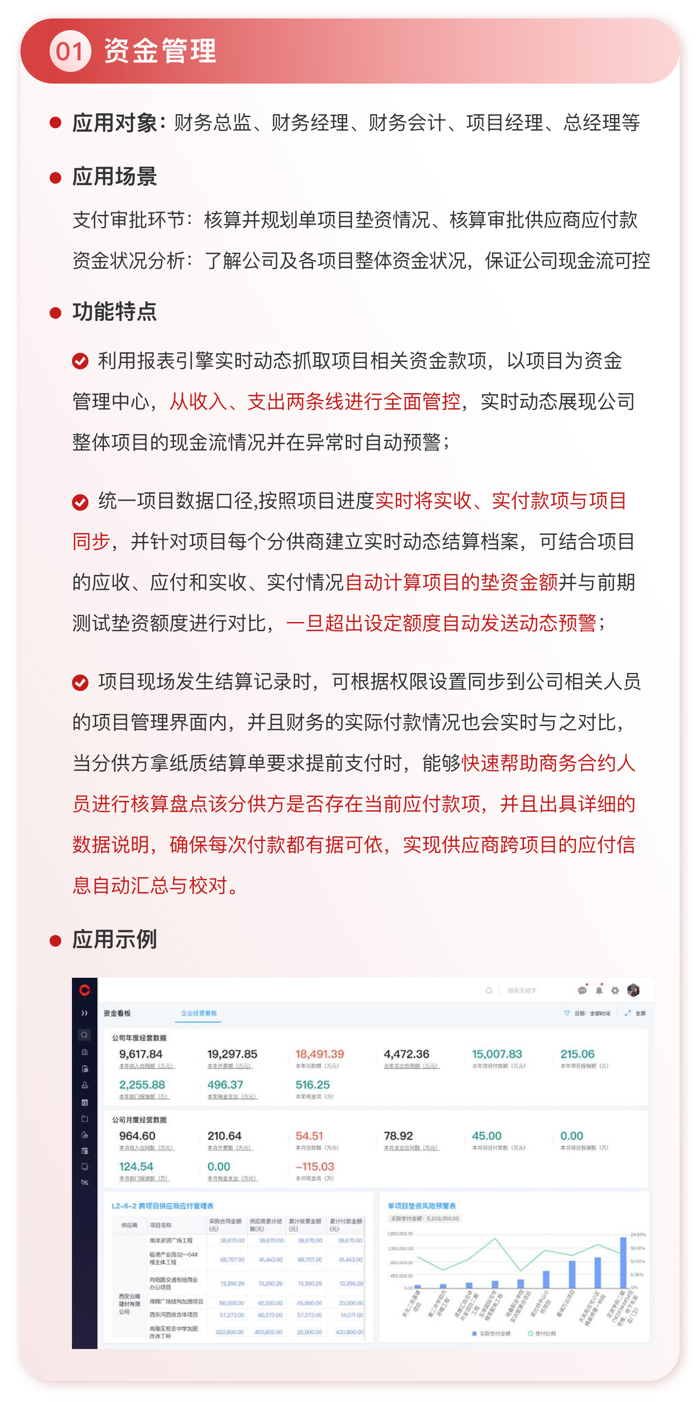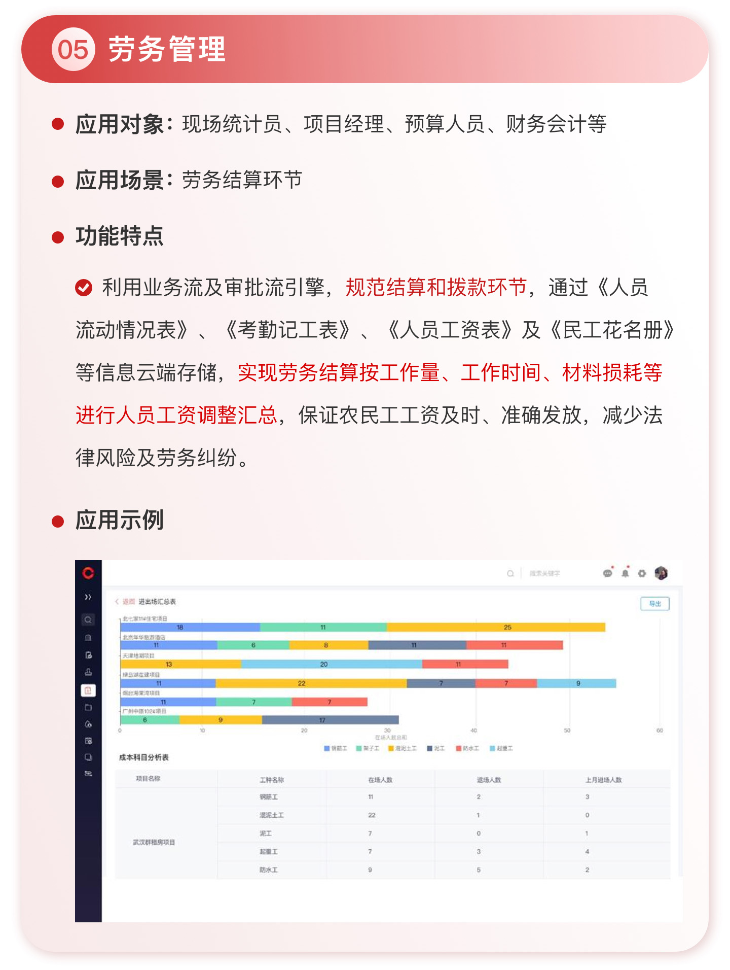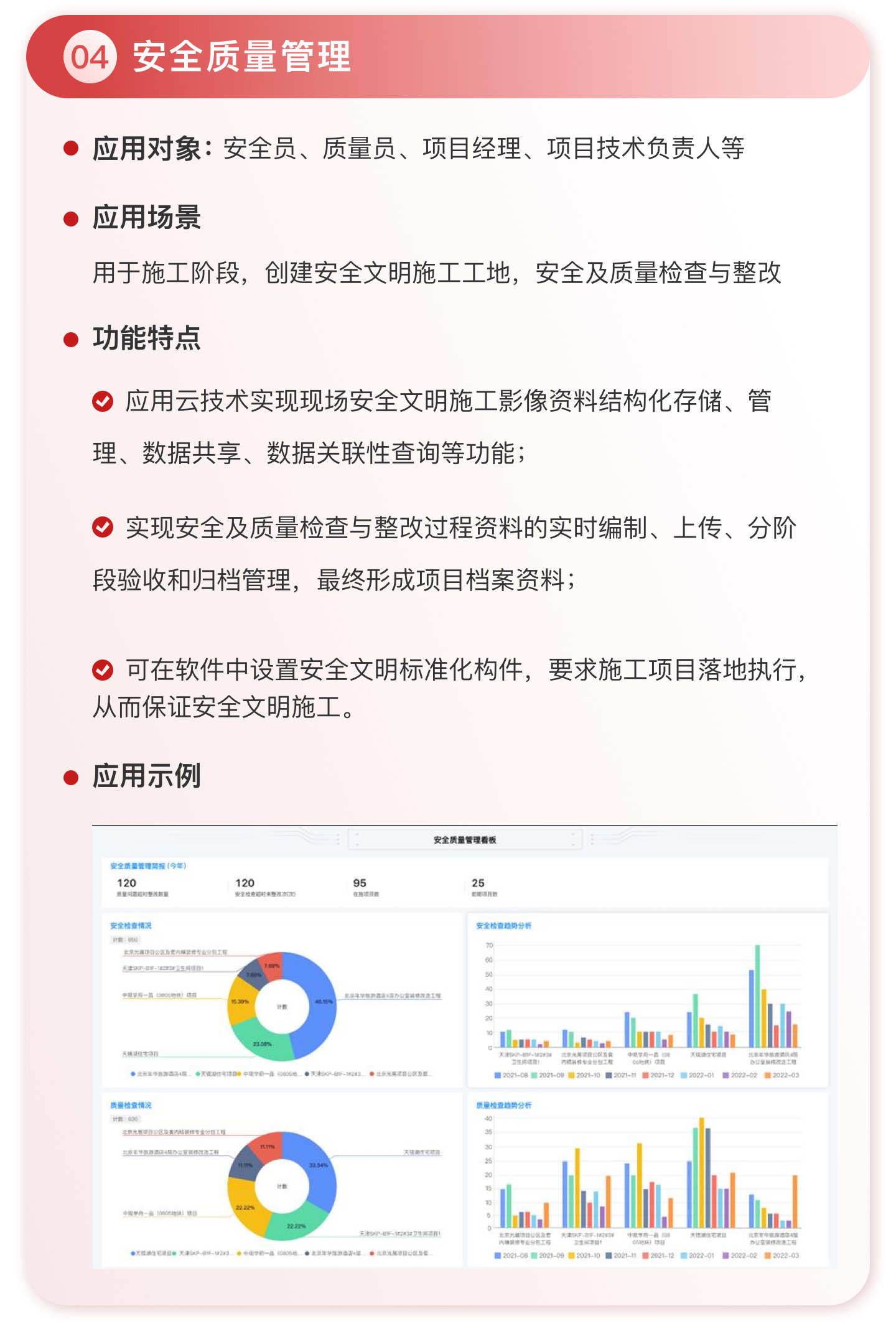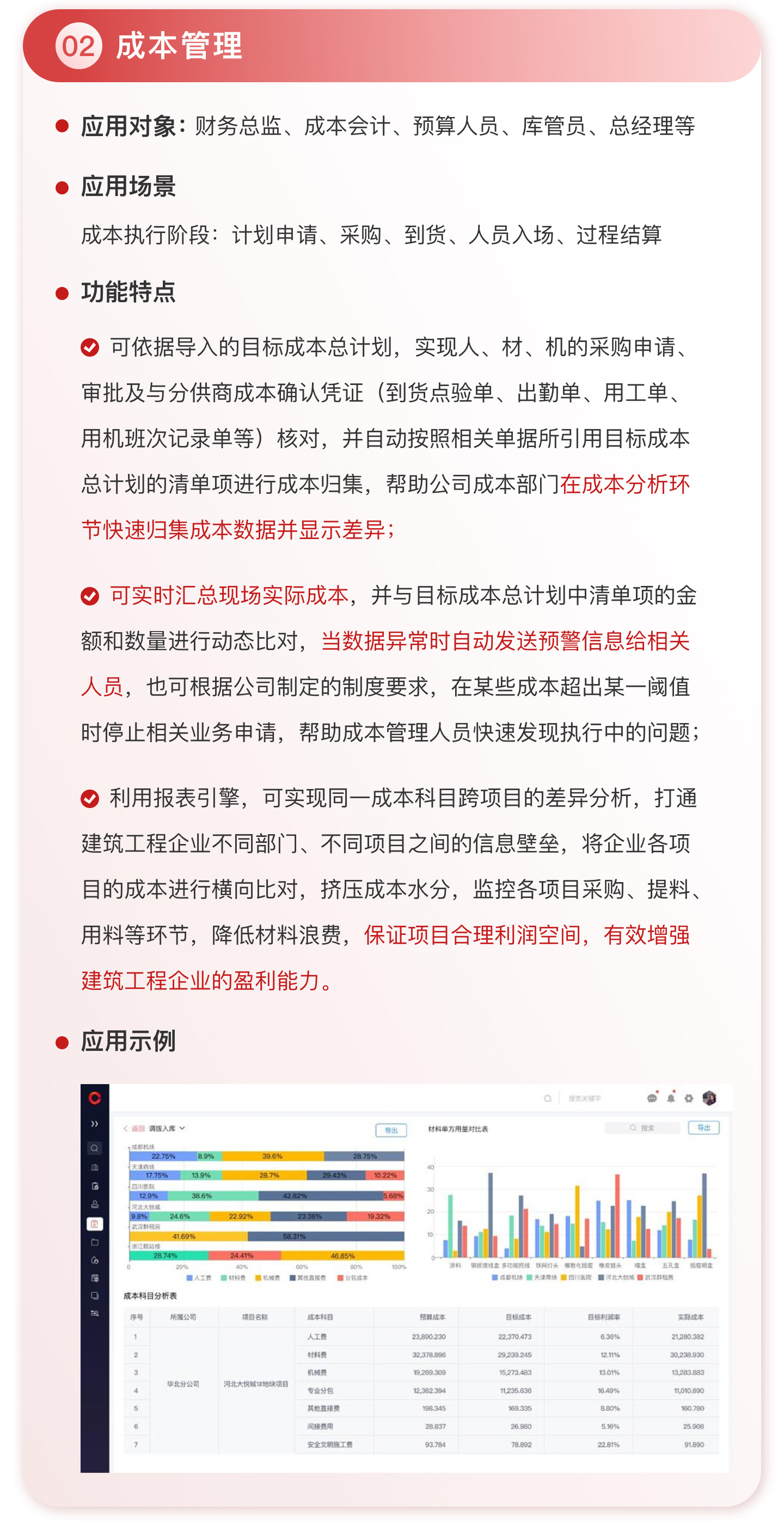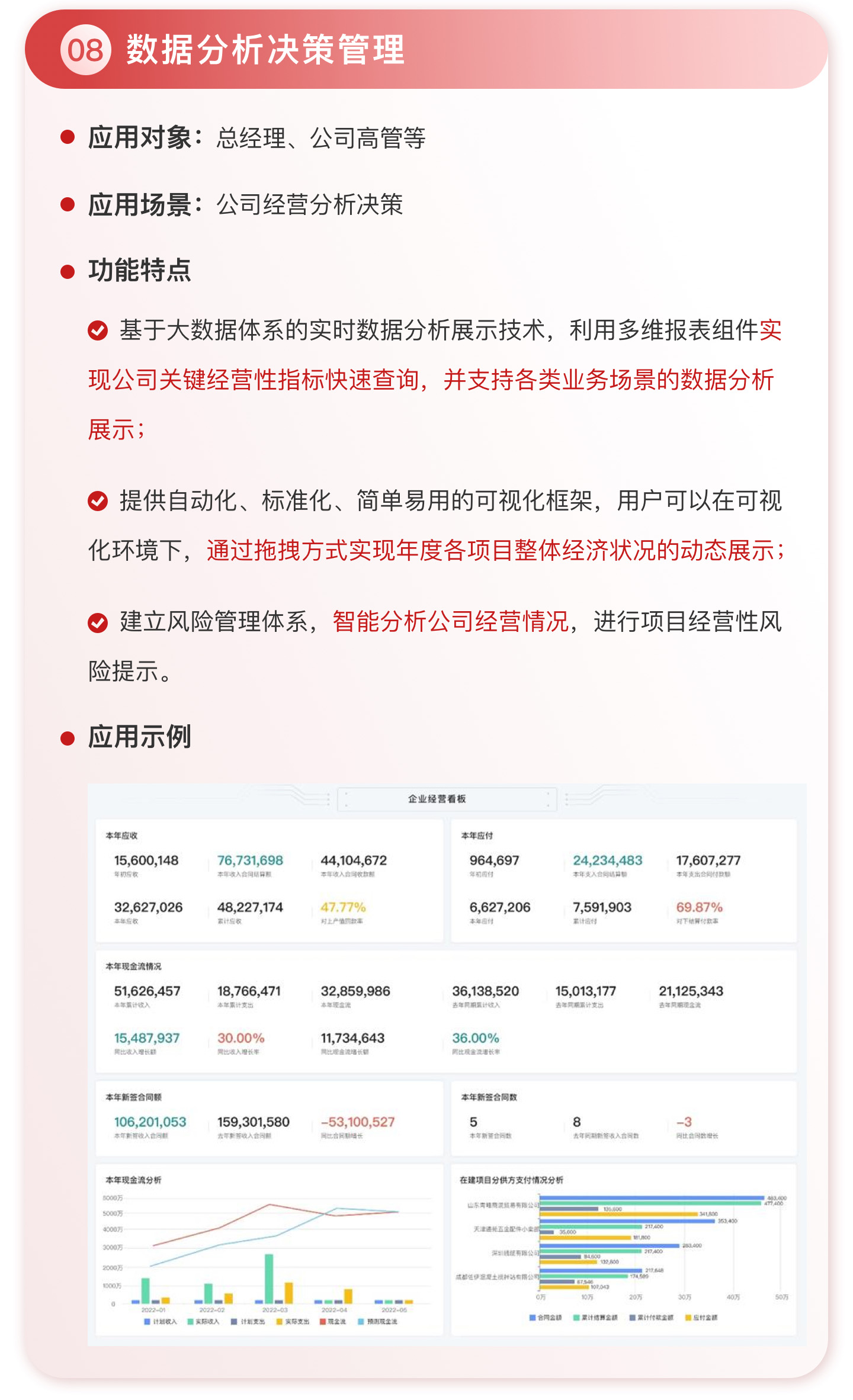 此外,紅圈系統能夠為建筑工程企業決策者實時呈現動態數據、提供智能數據分析,讓管理者實時了解項目的整體運營效率及效益是否達標、經營風險是否可控,滿足建筑工程企業數字化管理升級的需求,提升企業經營管理能力,實現工程項目施工全生命周期的降本增效。該產品主要應用于產值為 5,000 萬-20 億的建筑工程行業企業。