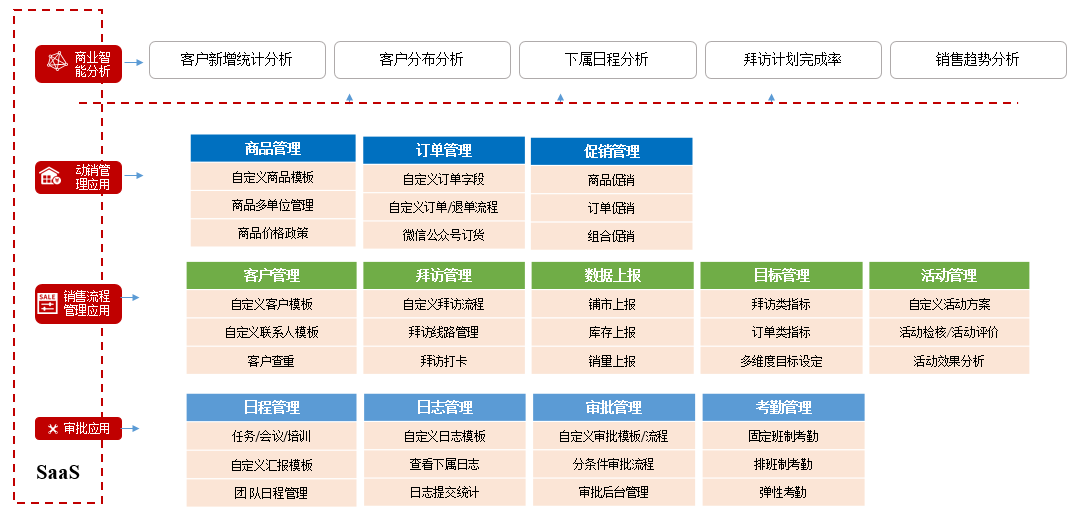 紅圈營銷+是一款兼顧通用協同辦公應用基礎上,主要為泛快消行業客戶提供客戶管理與銷售協同管理的客戶關系管理 SaaS 產品。產品具有進銷存管理、車銷管理、數據上報、營銷活動管理、目標管理等功能,幫助企業有效控制營銷費用和通路管理,提高銷售管理效率,為企業提供數據賦能,助力模式轉型。