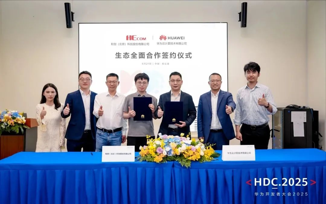 在2025華為開發者大會期間,和創(北京)科技股份有限公司(以下簡稱“和創科技”)與華為云計算技術有限公司(以下簡稱“華為云”)簽署生態全面合作協議,雙方將在聯合解決方案構建、AI應用開發及行業大模型共創等領域展開全方位合作,共同推動新一代人工智能產品在工程行業的應用落地。在和創科技CEO劉學臣、華為云生態發展與運營部部長陶志強的共同見證下,和創科技副總裁王禹、華為云北京云生態發展與運營部部長代表雙方完成簽約。