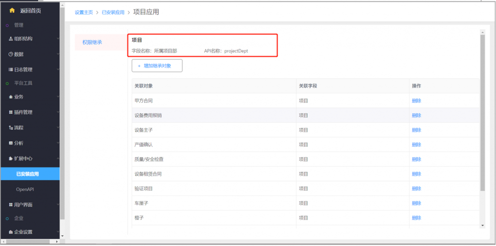 1)開通項目多維度后,在后臺已安裝應用中,可以看到“項目應用”;打開后可以看到項目上已經增加的部門字段名稱和API