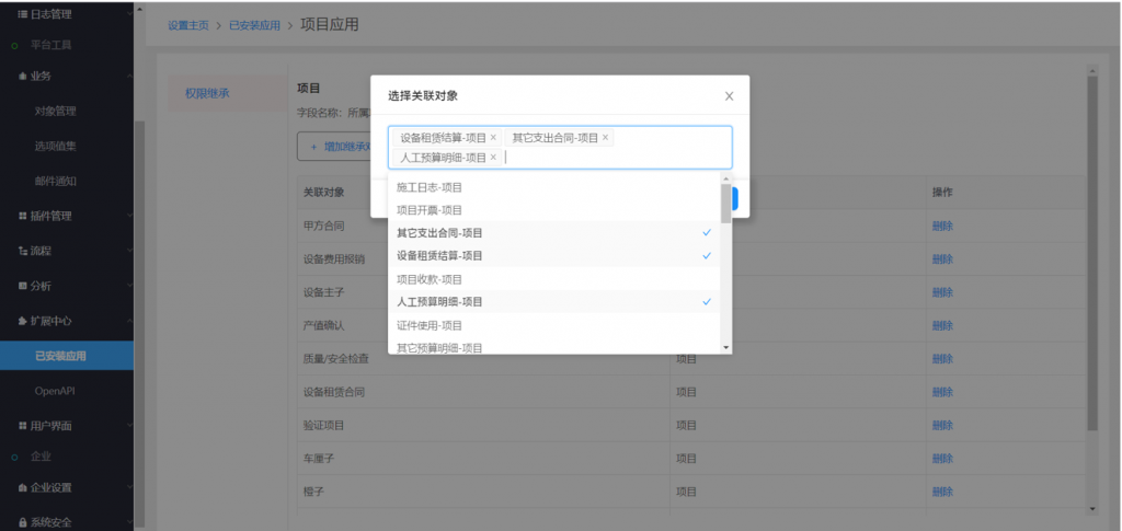 2)添加與項目關聯的業務對象,如合同、收付款、開票、設備和工程量清單等;