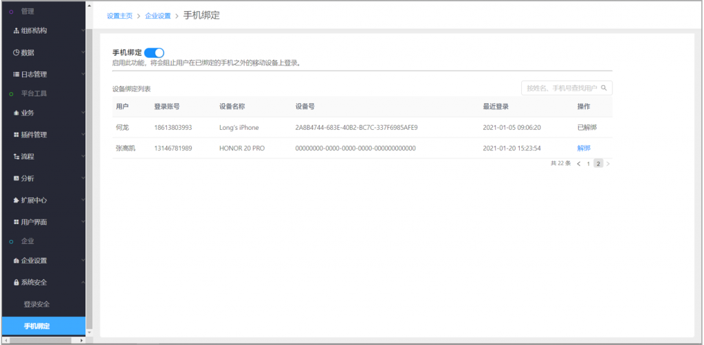開啟后,用戶在手機端登錄綁定后,會生成一條綁定數據