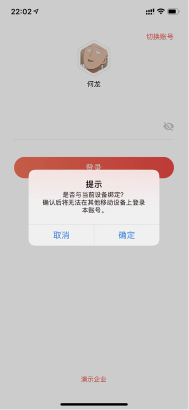 功能開啟后,賬號第一次在移動端登錄時,將提示進行設備綁定,同意后可正常進入系統使用;取消則無法登錄,如果需要更換手機,請聯系管理員進行后臺的解綁操作
