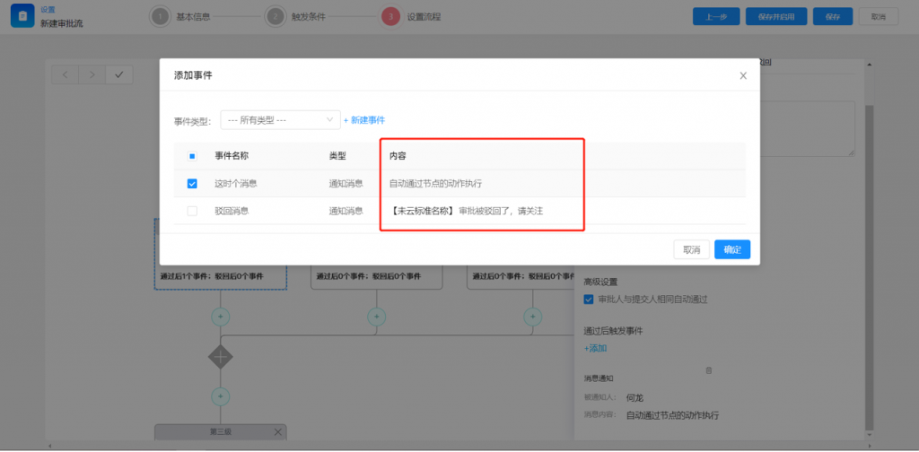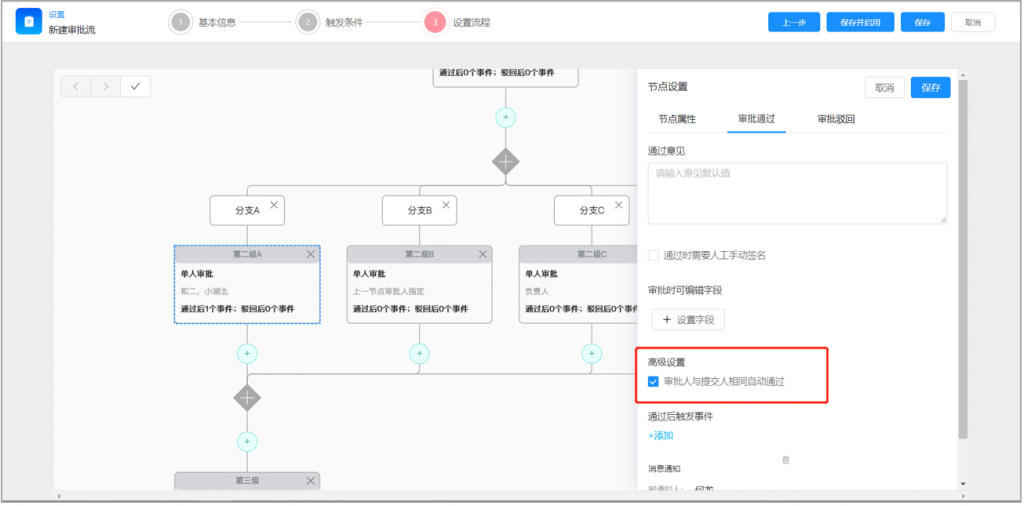 2)審批流節點,可配置當與提交人相同時,自動通過,減少重復操作