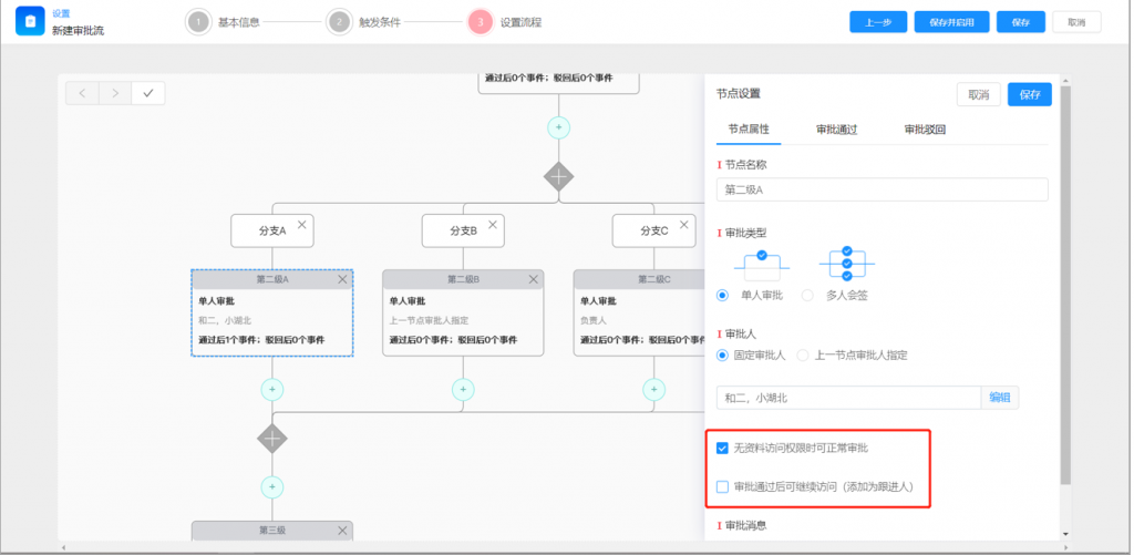 3)當節點審批人沒有數據權限時,可以通過配置實現臨時授權,還能再審批后添加為跟進人,在保持數據權限的不擴散的前提下,保障特殊審批節點的順利推進