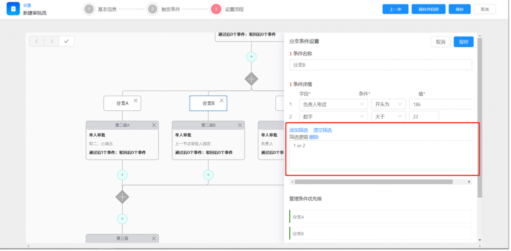 7)審批流分支條件,支持高級篩選邏輯