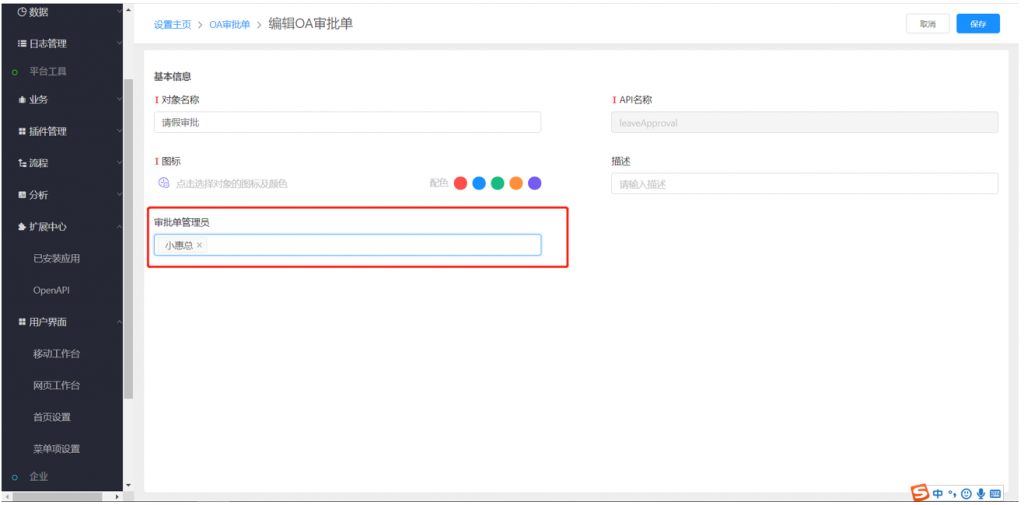 1)在OA審批單基本信息中,增加管理員配置,可選擇某些員工作為該審批單管理員