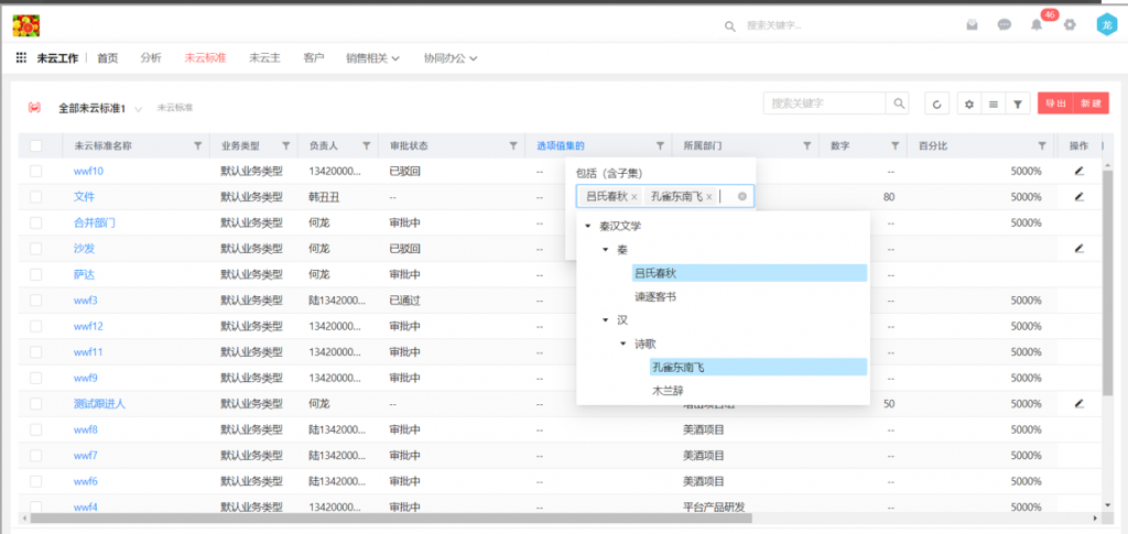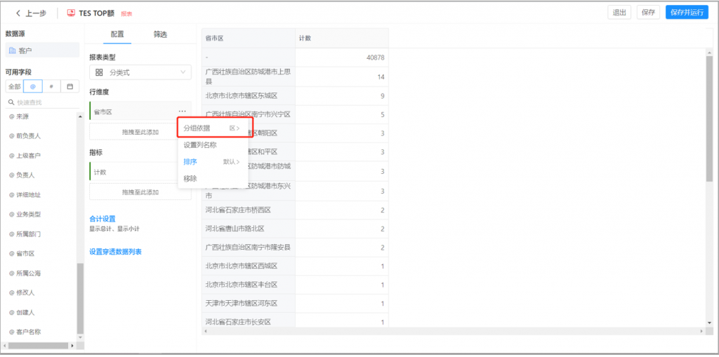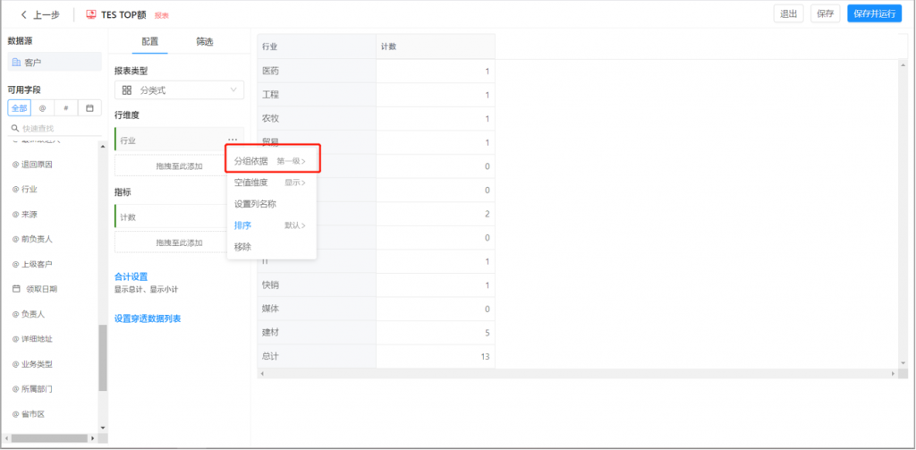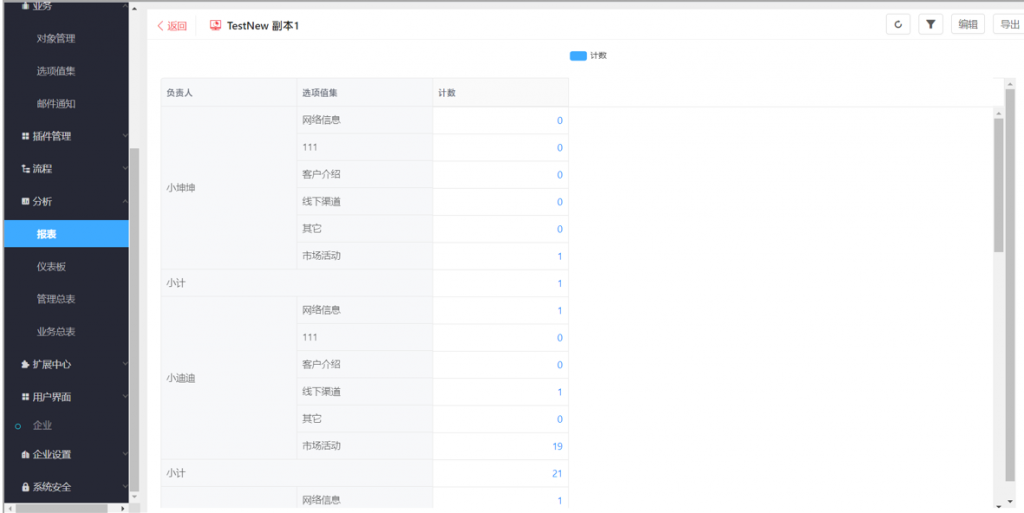 2)選項值集的單選字段,在作為維度時,可以分層級統計,類似部門;比如選擇一級進行查看,每行維度會匯總當前一級選項以及所有下級選項的數據