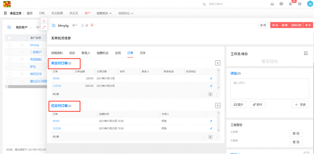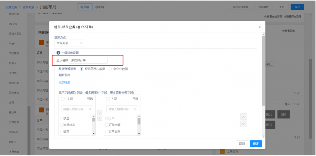 4)對象詳情頁相關列表組件可修改名稱,如在客戶詳情頁中,可以配置兩個訂單列表,分別命名為已交付訂單和未交付訂單