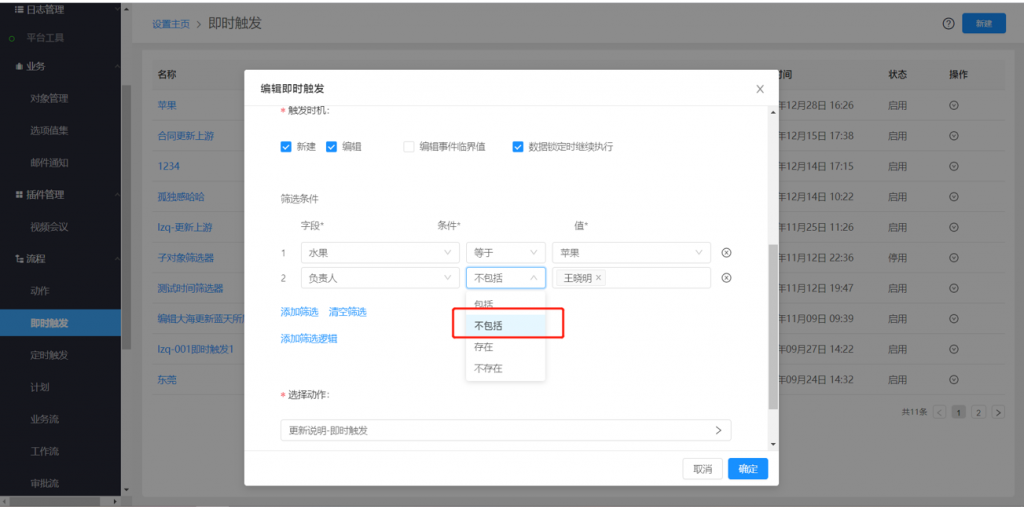 6)后臺配置的篩選條件中,員工和部門支持“不包括”條件,如審批流的分支條件