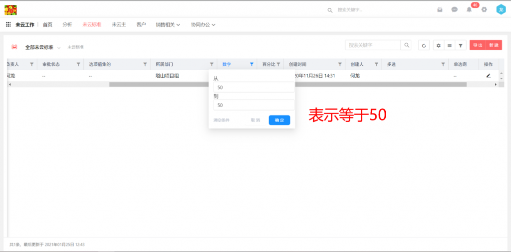 7)數據列表中,數值型字段在表頭篩選時可以只輸入一邊,或者兩邊輸入相同數值,進行篩選