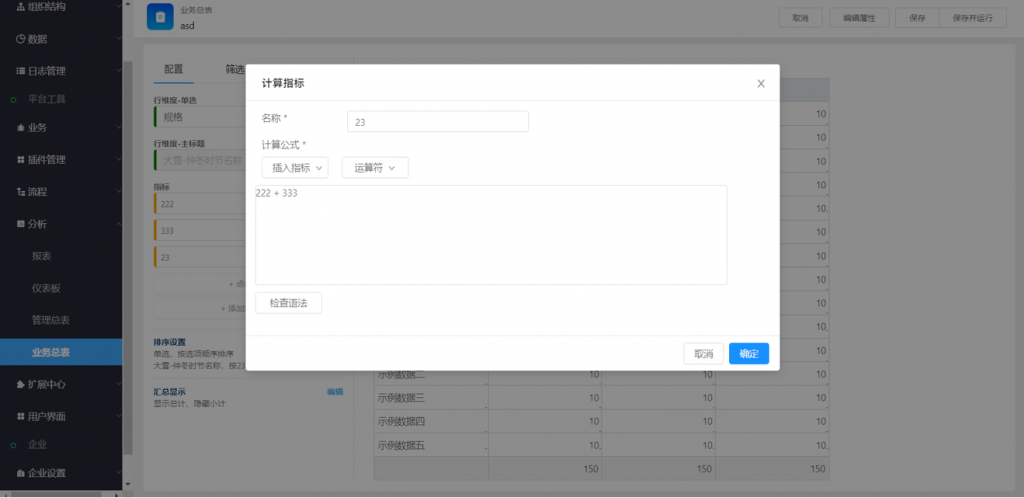 1) 與管理總表類似,業務總表中增加了計算指標,支持指標列之間進行簡單四則運算,滿足更多的分析場景