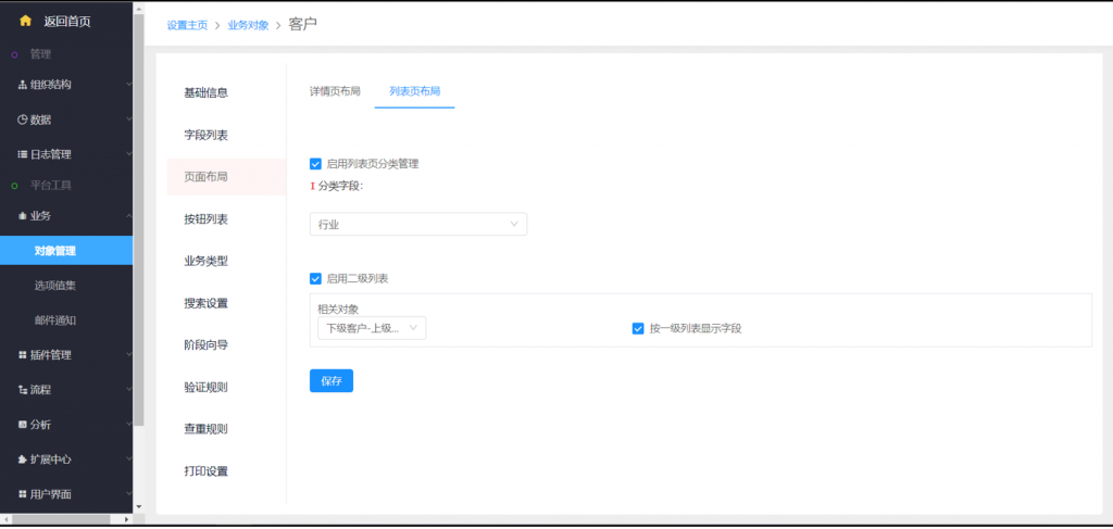 對象列表布局,設置二姐列表功能時,如果選擇的下游對象是本對象,則可以選擇按一節大列表顯示字段配置,也可以自己手動配置