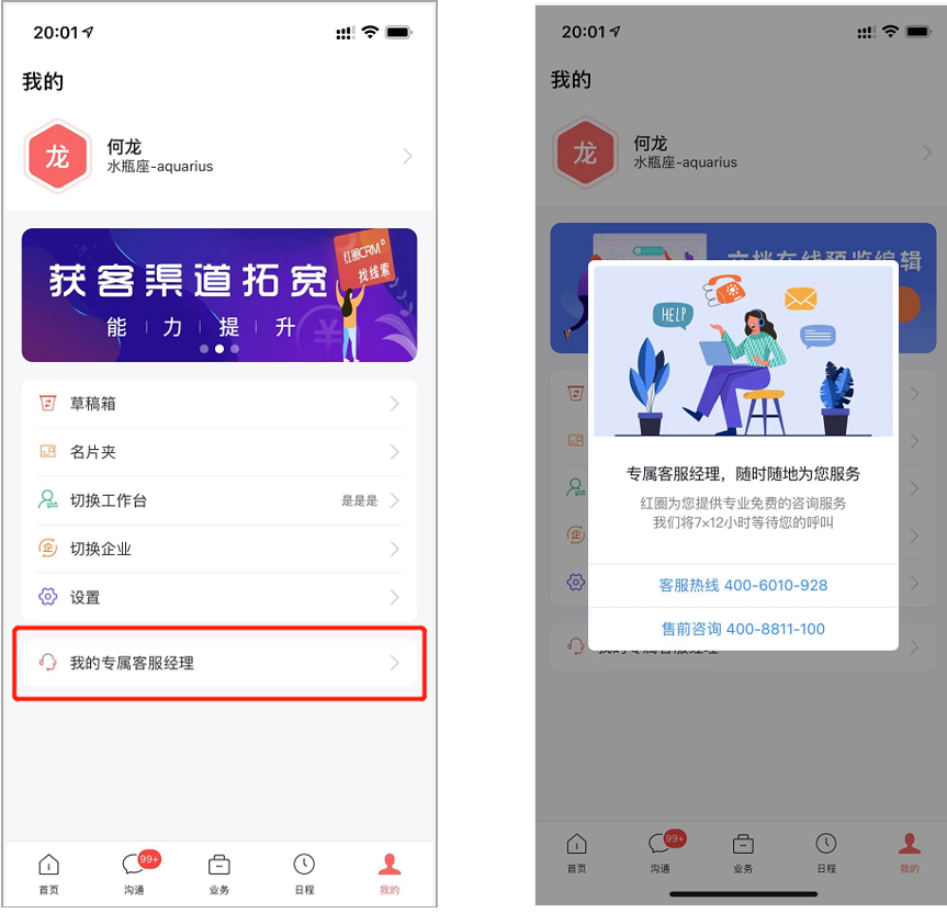 3)移動端在“我的”中,增加專屬客服經理的電話展示