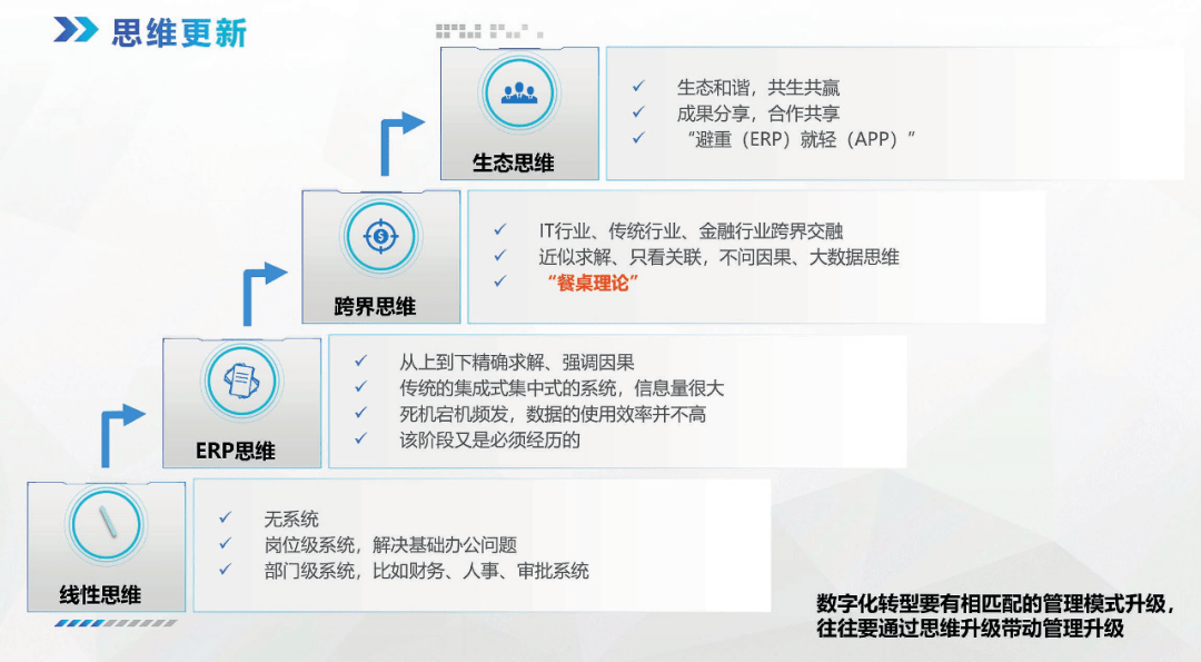 思維模式可以分為線性思維、ERP思維、跨界思維和生態(tài)思維。不同的思維方式會影響企業(yè)數字化的進程(圖6)。