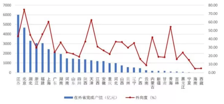 圖4  2021年上半年各地區跨省完成的建筑業總產值及外向度