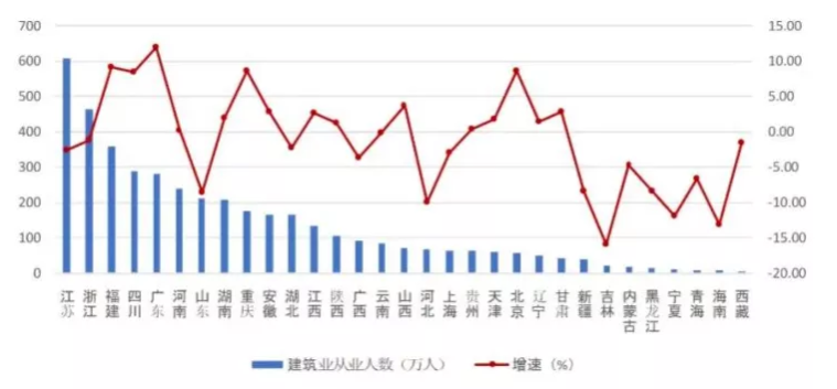 圖5  2021年上半年各地區建筑業從業人數及其增長情況