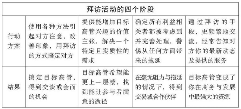 一次拜訪活動(dòng)結(jié)束后,它的回應(yīng)率、投資回報(bào)率、支出和收入數(shù)字,都可以告訴你活動(dòng)是否成功。不過,據(jù)我發(fā)現(xiàn),在活動(dòng)進(jìn)行過程中,歸類分析每一位目標(biāo)客戶,然后跟蹤他們的變動(dòng)順序,總是能幫助你取得最好的結(jié)果。這就是下面我們分析“四個(gè)拜訪階段”的用意:幫助你為每一次拜訪活動(dòng)準(zhǔn)備一套標(biāo)準(zhǔn)的評(píng)估系統(tǒng),因地制宜地實(shí)施必要的行動(dòng),從而最大限度地提高營(yíng)銷活動(dòng)的成功率。