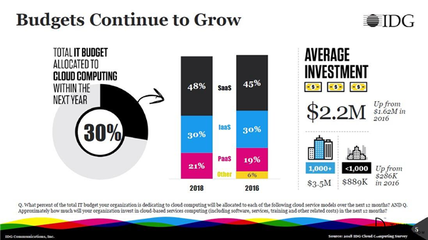 企業(yè)預(yù)計它們今年在云apps、平臺和服務(wù)中的評價投入為350萬美元。在接下來一年預(yù)算的分配中,30%分配給了云計算,其中大部分是SaaS(48%)、IaaS(30%)和PaaS(21%)。同時,對云計算應(yīng)用和平臺的投資也在快速提升,對此企業(yè)的平均投資額達(dá)到220萬美元,高于2016年的162萬美元。
