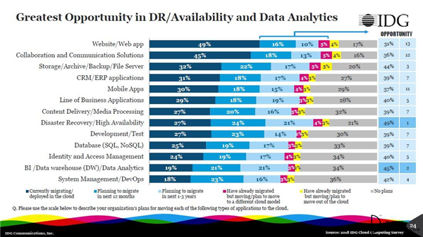 在所有的云應(yīng)用領(lǐng)域與遷移中中,數(shù)據(jù)分析和災(zāi)難恢復(fù)具有最大的機(jī)會。49%的組織計劃在未來一年到三年中將災(zāi)難恢復(fù)/高可用性系統(tǒng)遷移到云端。而45%的組織計劃在未來一年到三年中將BI、數(shù)據(jù)倉庫和數(shù)據(jù)分析應(yīng)用遷移到云。目前,云計算正被視為一種增長催化劑,它所支持的應(yīng)用程序正在消除企業(yè)收入增長的障礙,并幫助它們在穩(wěn)定運(yùn)營的同時獲得新客戶。