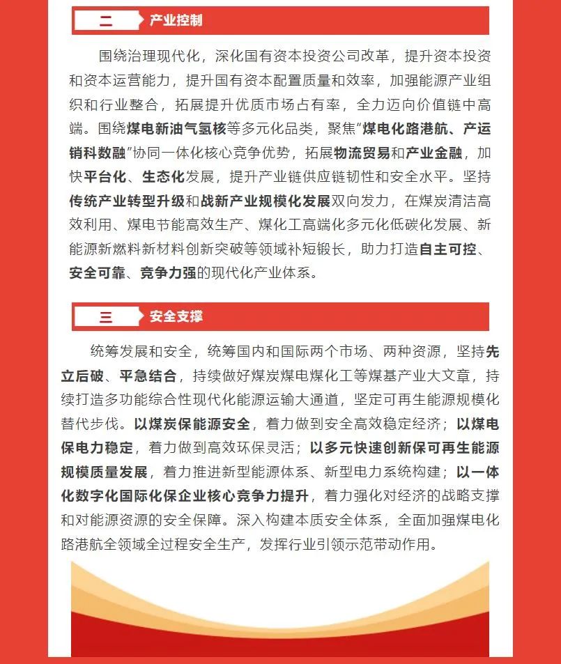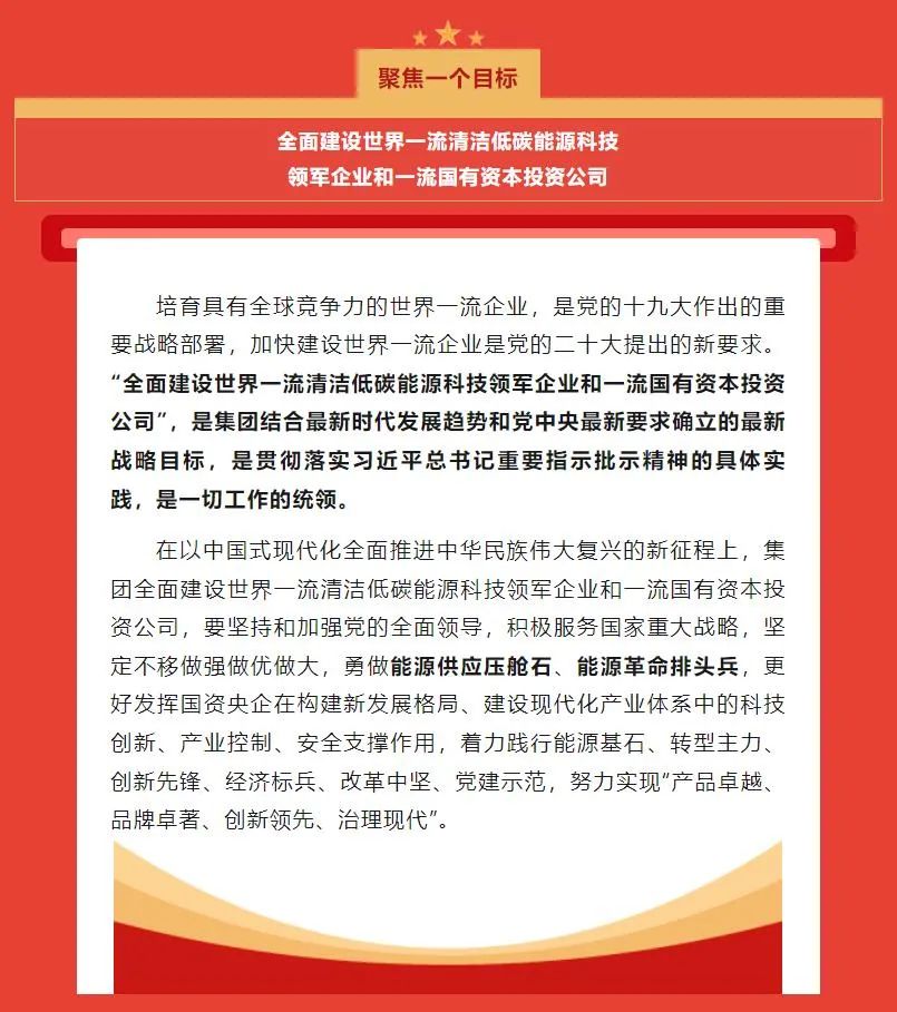 此前,國家能源集團發展戰略為“一個目標、三型五化、七個一流”。一個目標是指建設具有全球競爭力的世界一流能源集團;三型五化是指打造創新型、引領型、價值型企業,推進清潔化、一體化、精細化、智慧化、國際化發展;七個一流是指實現安全一流、質量一流、效益一流、技術一流、人才一流、品牌一流和黨建一流。