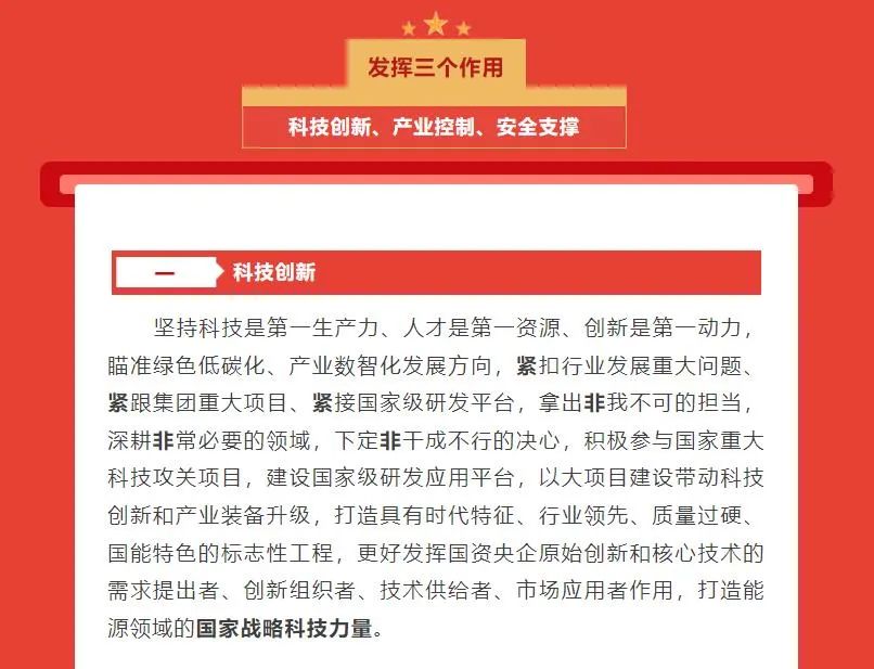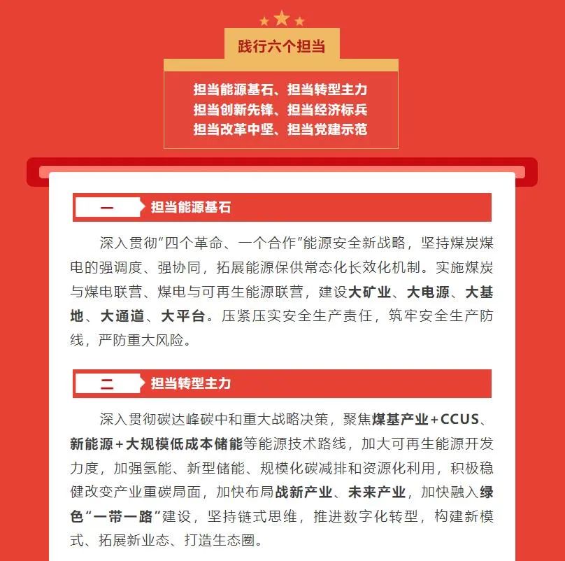 國家能源集團最新確立了“一個目標、三個作用、六個擔當”發展戰略。一個目標是指“全面建設世界一流清潔低碳能源科技領軍企業和一流國有資本投資公司”,三個作用是指發揮科技創新、產業控制、安全支撐作用,六個擔當是指擔當能源基石、擔當轉型主力、擔當創新先鋒、擔當經濟標兵、擔當改革中堅、擔當黨建示范。