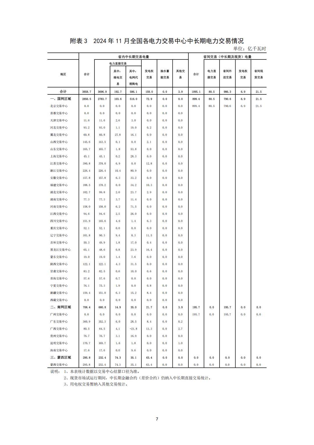分區域看,1-11月,國家電網區域中長期電力直接交易電量合計為32001.1億千瓦時,同比增長5.4%;南方電網區域中長期電力直接交易電量合計為7759.8億千瓦時,同比增長5.2%;蒙西電網區域中長期電力直接交易電量合計為2430.6億千瓦時,同比增長11.1%。