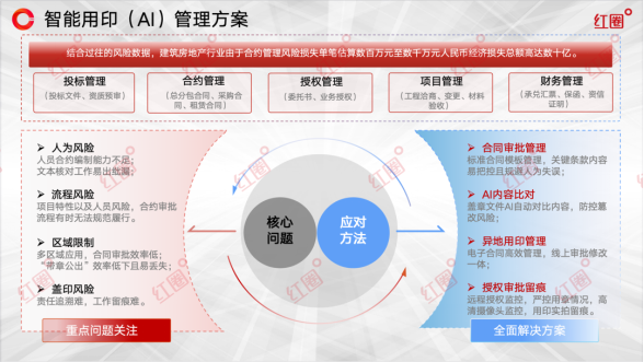 在企業(yè)的運(yùn)營(yíng)脈絡(luò)中,印章雖小,卻承載著沉重的法律責(zé)任與經(jīng)濟(jì)風(fēng)險(xiǎn)。面對(duì)合同協(xié)議繁多、應(yīng)用場(chǎng)景復(fù)雜的業(yè)務(wù)環(huán)境,特別是對(duì)于建筑工程類企業(yè)而言,依賴人工管理的傳統(tǒng)用印模式已顯疲態(tài),在風(fēng)險(xiǎn)控制與運(yùn)營(yíng)效率方面捉襟見肘?;趯?duì)建筑行業(yè)數(shù)字化進(jìn)程的深刻洞察,紅圈軟件推出了「智能AI印控一體化解決方案」,旨在以科技創(chuàng)新驅(qū)動(dòng)管理變革,引領(lǐng)企業(yè)實(shí)現(xiàn)用印流程全面、徹底的數(shù)字化與智能化轉(zhuǎn)型。