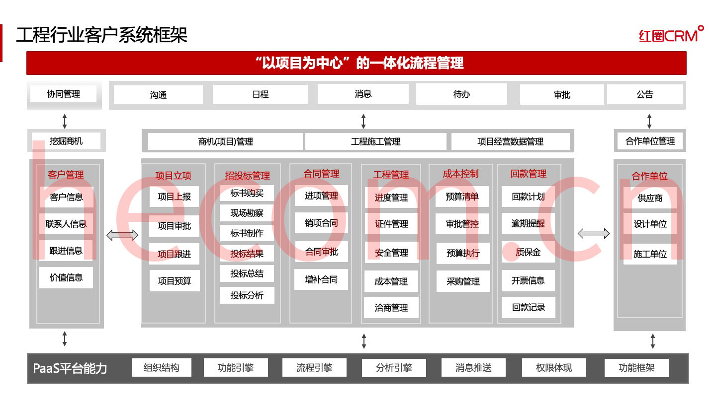 基于紅圈 PaaS 平臺構建的紅圈工程行業(yè) CRM 項目管理系統(tǒng)可以全面提升企業(yè)信息化水平,實現(xiàn)全員實時在線移動辦公,對項目執(zhí)行過程進行精細化管理,規(guī)避項目資金風險,管控項目預算及成本的發(fā)生,進而徹底推動企業(yè)從被動管理到主動干預的轉變,以可視化的數(shù)據(jù)決策全面提升企業(yè)核心競爭力。